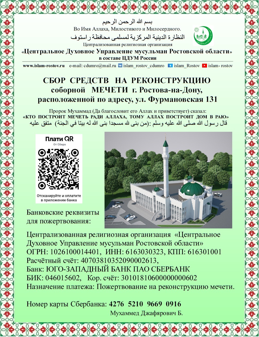 Центральное Духовное Управление мусульман Ростовской области, в целях удовлетворения нужд мусульман г. Ростова-на-Дону, продолжает сбор средств для расширения и реконструкции соборной МЕЧЕТИ г. Ростова-на-Дону, расположенной по адресу, ул. Фурмановская 131.